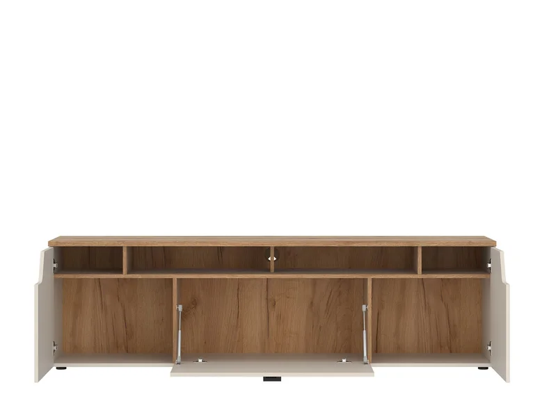 Ask us TV skapis TV skapītis CUT OUT CTUF02 — elegants mēbeļu elements ar modernu dizainu. Tas ir izgatavots no laminētas skaidu plātnes un apvieno koksni, kas imitē piekrastes ozolu, ar kašmira apdari. Funkcionālas durvis un mehānisms, kas nodrošina vienmērīgu aizvēršanu, garantē ērtu lietošanu. IZMĒRI: Platums: 195 cm Augstums: 56,5 cm Dziļums: 45 cm ĪPAŠĪBAS: Izgatavots no lamināta skaidu plātnes Eņģes: klusās aizvēršanas sistēma Krāsa: ozols/kašmirs Dimensions: 195 x 45 x 56.5 cm. Height: 56.5 cm; Width: 45 cm; Length: 195 см;Sell for 229.00 EUR.