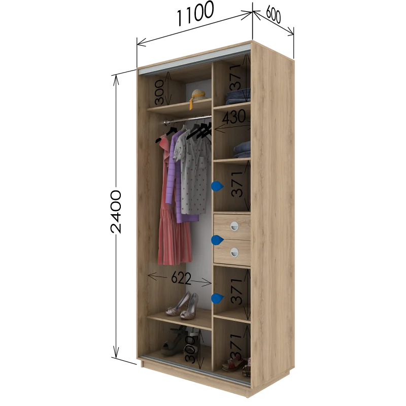 Skapji ar bīdāmām durvīm ir stilīgs un praktisks risinājums lietu glabāšanai dažādās telpās, sākot no guļamistabas un ģērbtuves līdz viesistabai un birojam. Tiem ir vairākas priekšrocības, kas padara tos par populāru izvēli daudzām mājām un birojiem: Vietas taupīšana: Viena no galvenajām bīdāmo durvju skapju priekšrocībām ir tā, ka tiem nav nepieciešama papildu telpa, lai atvērtu durvis uz priekšu. Tā vietā durvis slīd gar skapi, atbrīvojot vietu skapja priekšā. Stils un dizains: skapjiem ar bīdāmām durvīm var būt moderns, minimālistisks dizains, kas piešķir telpas interjeram eleganci. Tie ir pieejami arī dažādos stilos, sākot no klasiskā līdz modernam, atbilstoši jūsu gaumei. Organizācija un glabāšana: skapjiem ar bīdāmām durvīm parasti ir iekšējie plaukti, atvilktnes un pakaramie, kas nodrošina ērtu un organizētu dažādu priekšmetu, tostarp apģērbu, apavu, trauku, grāmatu un citu priekšmetu, uzglabāšanu. Caurspīdīgas durvis: Dažos bīdāmo durvju skapju modeļos tiek izmantotas skaidras vai spoguļdurvis, kas telpā var radīt telpas un gaismas sajūtu. Regulējamas funkcijas: daudziem skapjiem ir regulējami plaukti un pakaramie, kas ļauj tos pielāgot savām vajadzībām. Materiāli un apdare: izvēlieties skapja materiālus un apdari, kas atbilst jūsu dekoram un stilam. Skapjus var izgatavot no koka, koka dēļiem, stikla, metāla un citiem materiāliem. Cena un budžets: bīdāmo durvju skapjiem ir plašs cenu klāsts, lai jūs varētu atrast savam budžetam atbilstošu iespēju. Izvēloties drēbju skapi ar bīdāmām durvīm, ir svarīgi ņemt vērā tā izmēru, funkcionalitāti un stilu, lai nodrošinātu, ka tas atbilst jūsu interjeram un atbilst jūsu uzglabāšanas vajadzībām.